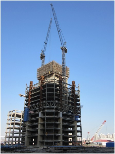该项目塔楼结构接纳双重抗侧力结构系统:巨型框架+伸臂桁架、环桁架+钢筋混凝土核芯筒(其中地下4层至地上10层设钢板剪力墙)。。。。。工程将于2016年5月总体安排结构封顶,,,,,,届时该修建将成为于家堡中心商务区最高楼。。。。。