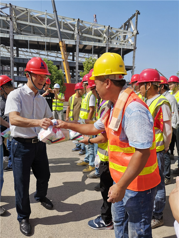 8月1日,,,,,,工会主席田新霖与工会委员李锋、本级工程中心代表丁巍、工业修建工程部代表朱一锋来到项目施工现场,,,,,,划分慰问了浙江梵学院二期(弥勒圣坛)工程、浙江华川深能环保义乌垃圾发电项目以及绍兴技师学院(筹)易地新建工程EPC总承包工程的一线施工职员。。。。每到一处,,,,,,工会向导都与员工逐一握手,,,,,,送上清凉礼包。。。。项目施工现场清洁整齐,,,,,,生爆发涯秩序井然。。。。工会主席田新霖特殊嘱咐项目现场认真人,,,,,,一定要落实好公司的相关防暑降温行动,,,,,,确保项目施工清静,,,,,,保质保量的完成施工使命。。。。